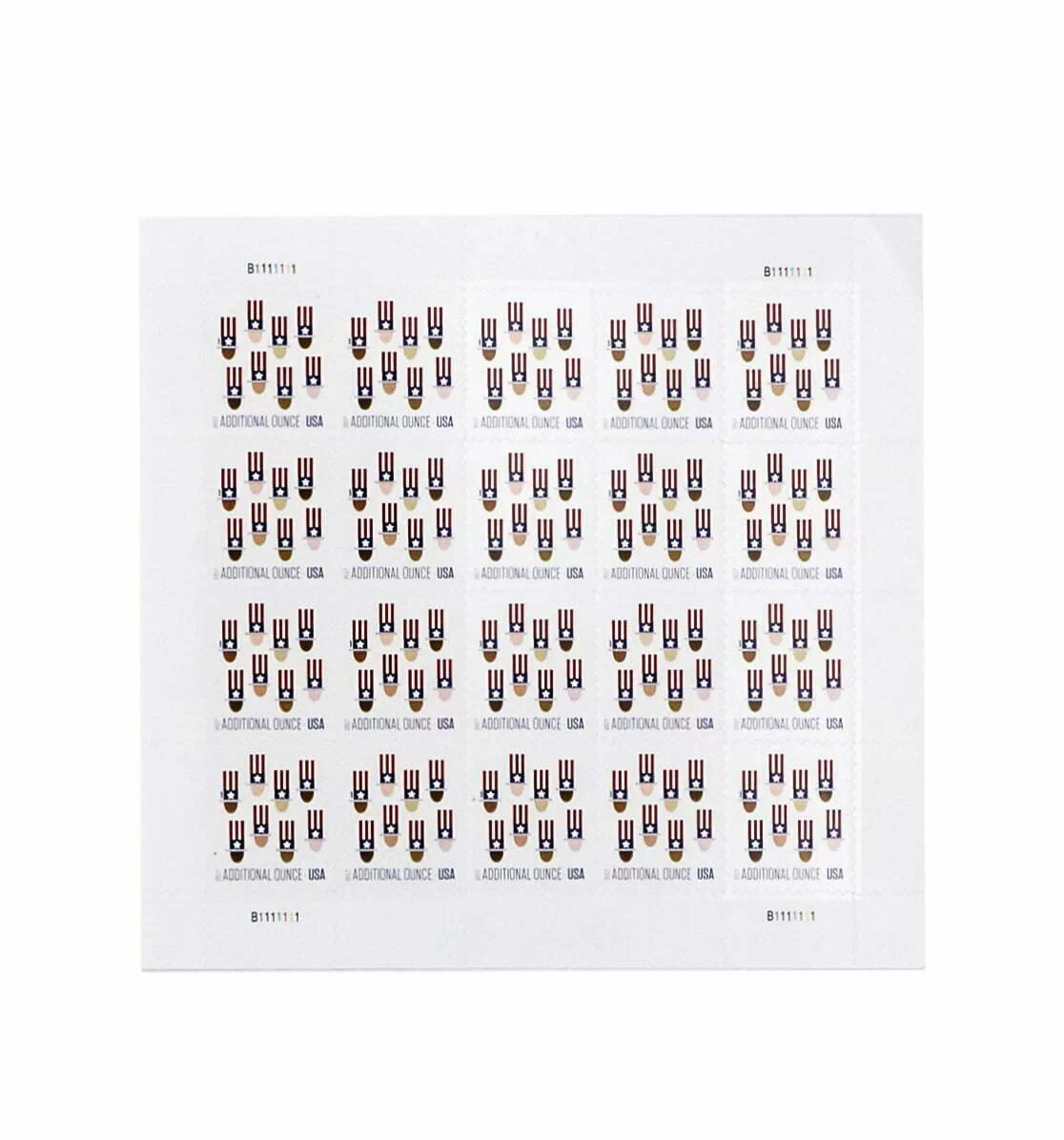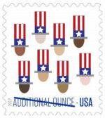 On February 18, 2017, in Mesa, AZ, the U.S. Postal Service issued the Uncle Sam??s Hat additional ounce rate stamp (Nondenominated priced at 21 cents), in one design. With the release of Uncle Sam??s Hat in 2017, the U.S. Postal Service celebrates one of our country??s most popular patriotic characters. The stamp features eight graphic top hats in Uncle Sam??s signature style, with red and white vertical stripes above a blue band with a white star and a gray brim. Beneath each hat is an oval shape representing a face, each in a different shade, meant to suggest the ethnic and racial diversity of the United States. Art director Antonio Alcal?? designed the stamp. The words ??ADDITIONAL OUNCE?? on this stamp indicate its usage value. Like a Forever stamp, this stamp will always be valid for the rate printed on it.