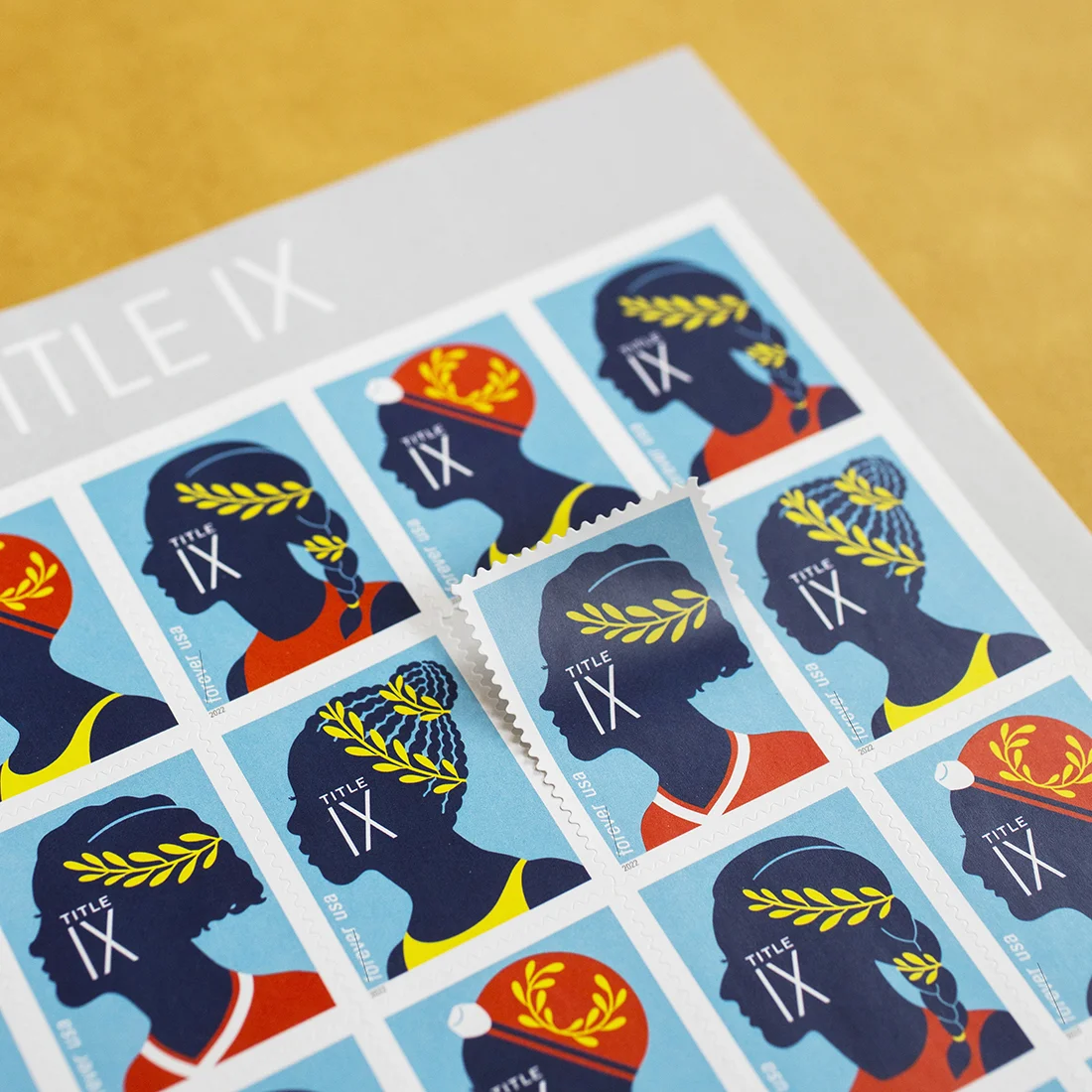 The stamp was issued to commemorate Title IX’s 50th anniversary. The design by artist Melinda Beck features a female runner in dark blue silhouette with yellow laurel branches, symbolizing victory.