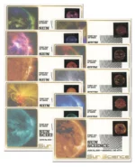 The Sun Science set includes 10 stamp designs, each picturing different sun details and phenomena. The colors represent different wavelengths, highlighting specific aspects of our sun.